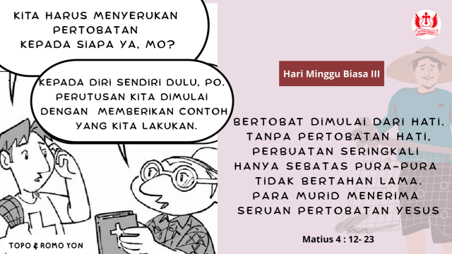 Renungan Mat 4:12–23 mengisahkan Yesus yang meninggalkan Nazaret dan menetap di Galilea, wilayah pinggiran yang dianggap gelap dan terabaikan. Justru disanalah Yesus memulai pelayanan-Nya dengan mengajar di rumah ibadat, mewartakan Kerajaan Allah, serta menyembuhkan orang sakit. Galilea melambangkan bagian terdalam dari diri kita, hati yang rapuh, penuh luka, dosa, dan ketidaksempurnaan. Yesus tidak datang ke tempat yang sudah terang, melainkan ke wilayah gelap untuk menyalakan terang-Nya.