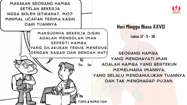 Tuhan Yesus juga mengingatkan kita agar menghayati iman itu dalam kerendahan hati seperti seorang hamba yang selalu siap mentaati perintah tuannya. Hamba yang tak meminta pujian tetapi selalu mendahulukan kehendak tuannya. Beriman dengan rendah hati berarti siap