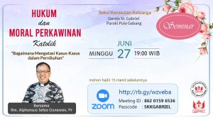Demikian diungkapkan Romo Alphonsus Setya Gunawan, Pr, saat menjadi pembicara dalam seminar online melalui aplikasi zoom, dengan tema “Hukum dan Moral Perkawinan Katolik : Bagaimana Mengatasi Kasus–Kasus dalam Pernikahan” pada Minggu (27/6/2021) pukul 19.00.