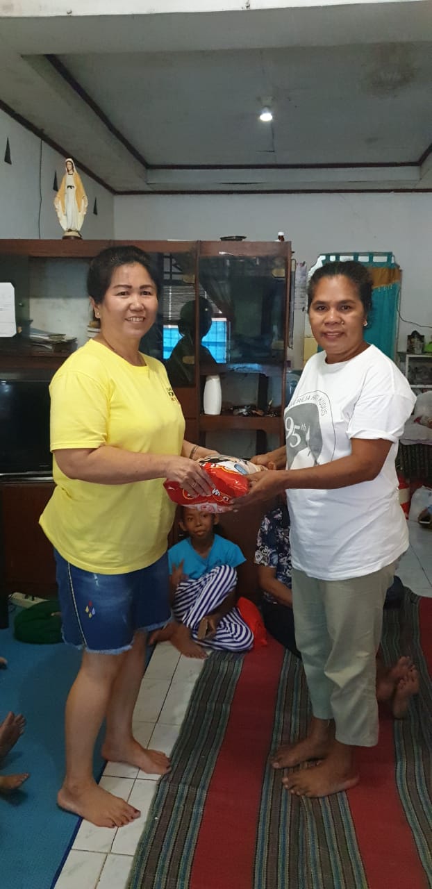 Rombongan kami tiba di lokasi sekitar pukul 11.20, dan disambut dengan antusias oleh sebagian umat yang tinggal di area tersebut. Bersama-sama mereka menurunkan “sembako kasih” yang dikumpulkan umat lingkungan untuk ditaruh di rumah Korwil 16. Sembako kasih itu berupa beras, minyak goreng, indomie, sabun, gula, biskuit yang memang dibutuhkan untuk kebutuhan hidup sehari-hari.